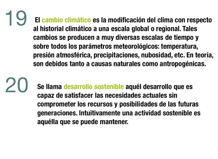 Se llama desarrollo sostenible aquél desarrollo que es capaz de satisfacer las necesidades actuales sin comprometer los recursos y posibilidades de las futuras generaciones. Intuitivamente una actividad sostenible es aquélla que se puede mantener.