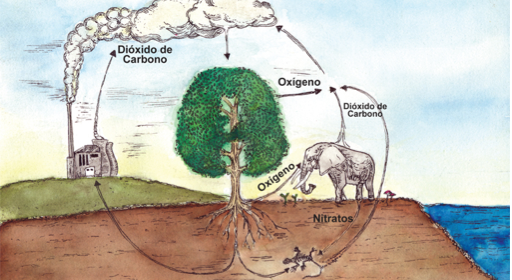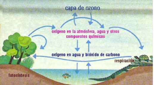 Al respirar los y animales los seres humanos tomamos del aire el oxígeno que las plantas producen y exhalamos gas carbónico. Las plantas cogen el gas que exhalamos para hacer el proceso de la fotosíntesis. Plantas animales y seres humanos intercambian el oxígeno y gas carbónico todo el tiempo lo vuelven a usar y los reciclan.
