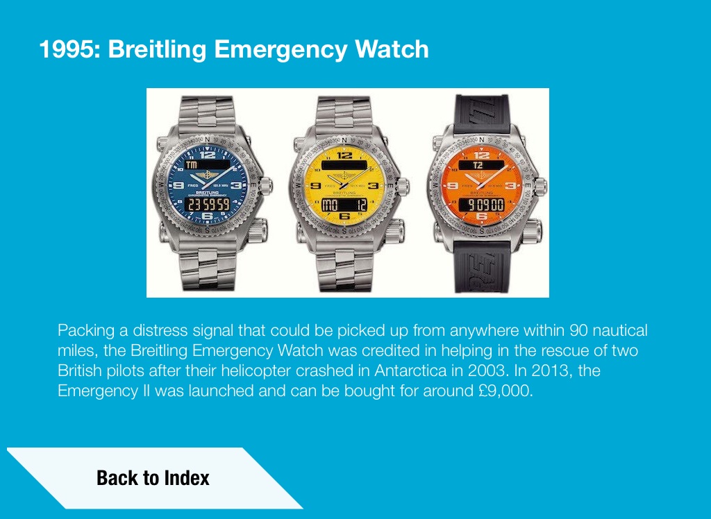 Packing a distress signal that could be picked up from anywhere within 90 nautical miles, the Breitling Emergency Watch was credited in helping in the rescue of two British pilots after their helicopter crashed in Antarctica in 2003. In 2013, the Emergency II was launched and can be bought for around £9,000.