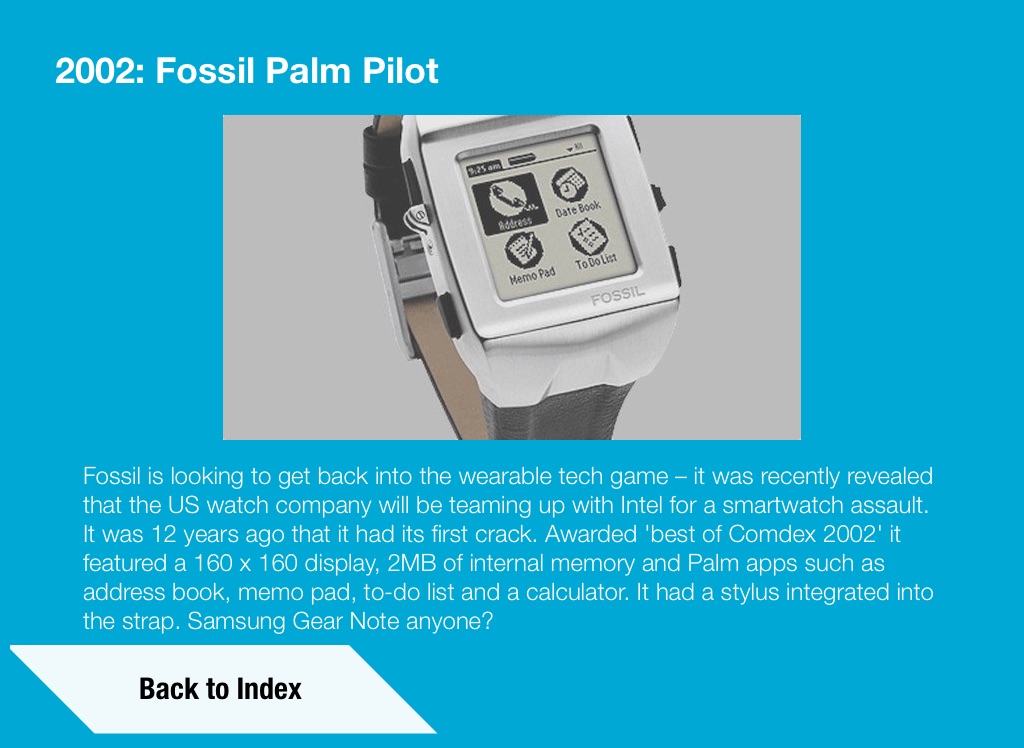 Fossil is looking to get back into the wearable tech game – it was recently revealed that the US watch company will be teaming up with Intel for a smartwatch assault. It was 12 years ago that it had its first crack. Awarded 'best of Comdex 2002' it featured a 160 x 160 display, 2MB of internal memory and Palm apps such as address book, memo pad, to-do list and a calculator. It had a stylus integrated into the strap. Samsung Gear Note anyone?
