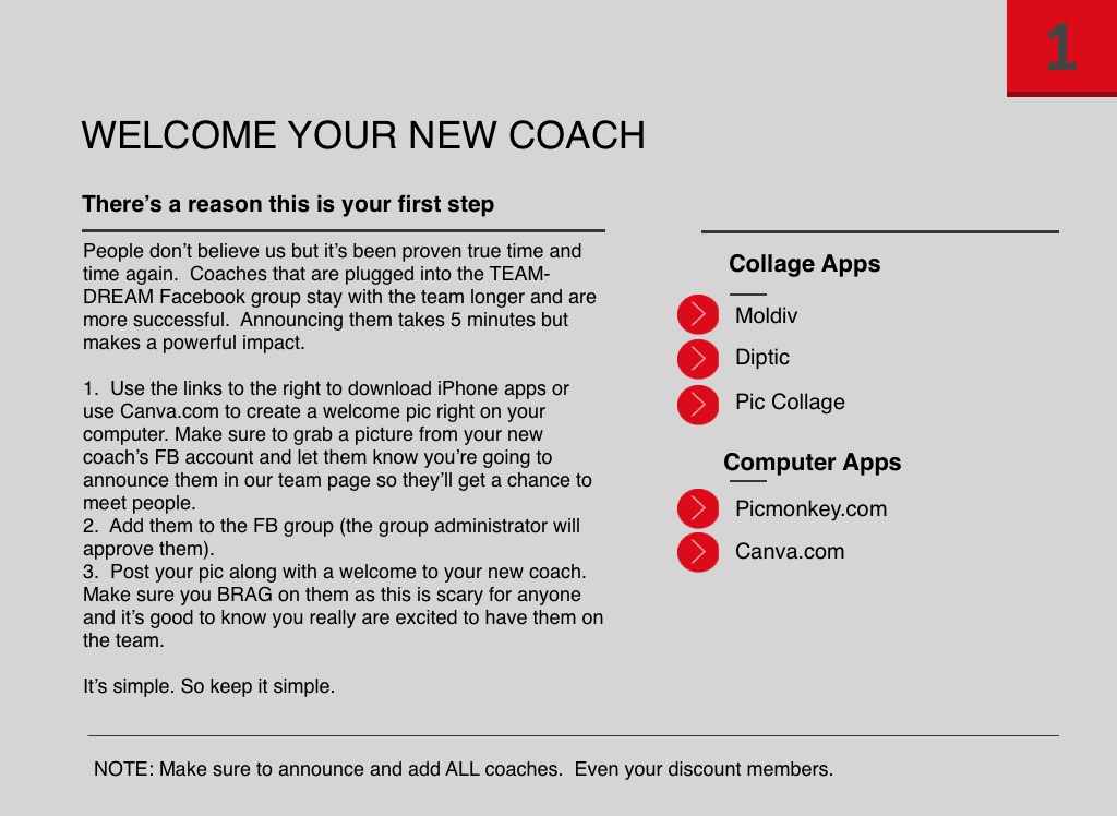 1. Use the links to the right to download iPhone apps or use Canva.com to create a welcome pic right on your computer. Make sure to grab a picture from your new coach’s FB account and let them know you’re going to announce them in our team page so they’ll get a chance to meet people.