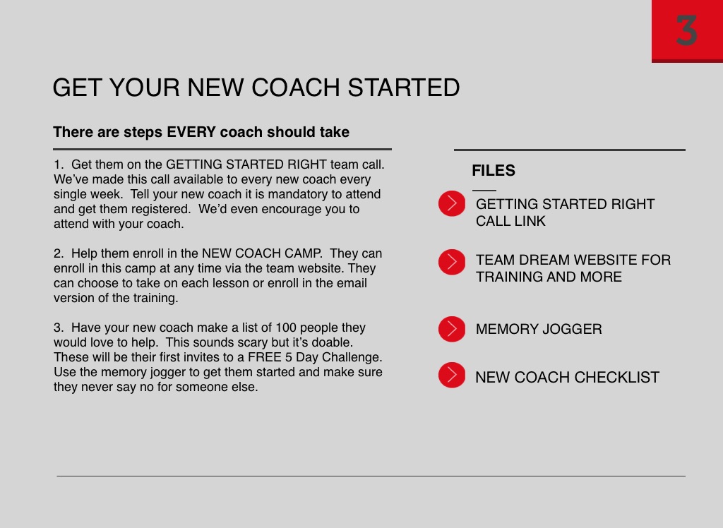 1. Get them on the GETTING STARTED RIGHT team call. We’ve made this call available to every new coach every single week. Tell your new coach it is mandatory to attend and get them registered. We’d even encourage you to attend with your coach.