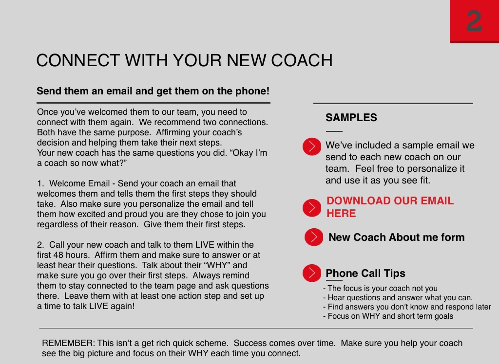 1. Welcome Email - Send your coach an email that welcomes them and tells them the first steps they should take. Also make sure you personalize the email and tell them how excited and proud you are they chose to join you regardless of their reason. Give them their first steps.