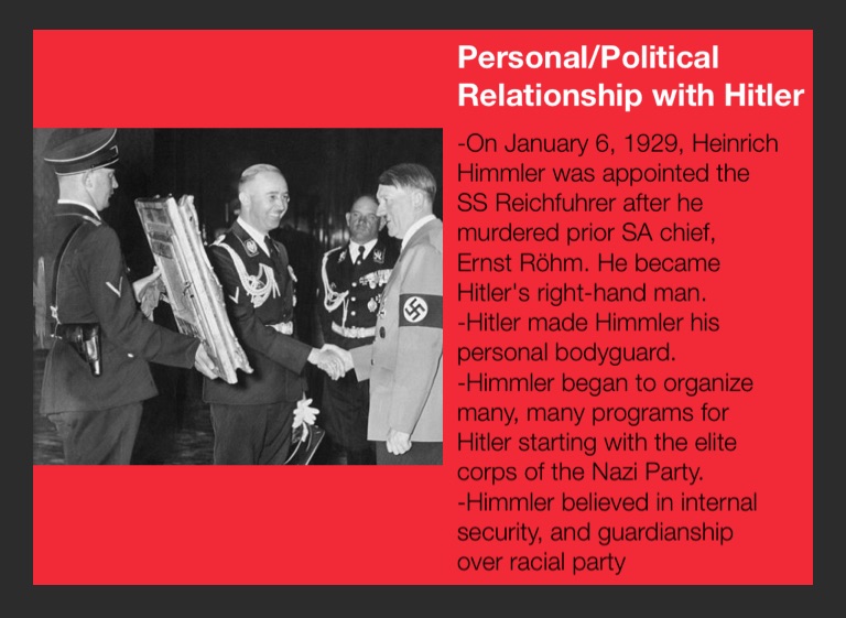 -On January 6, 1929, Heinrich Himmler was appointed the SS Reichfuhrer after he murdered prior SA chief, Ernst Röhm. He became Hitler's right-hand man.
