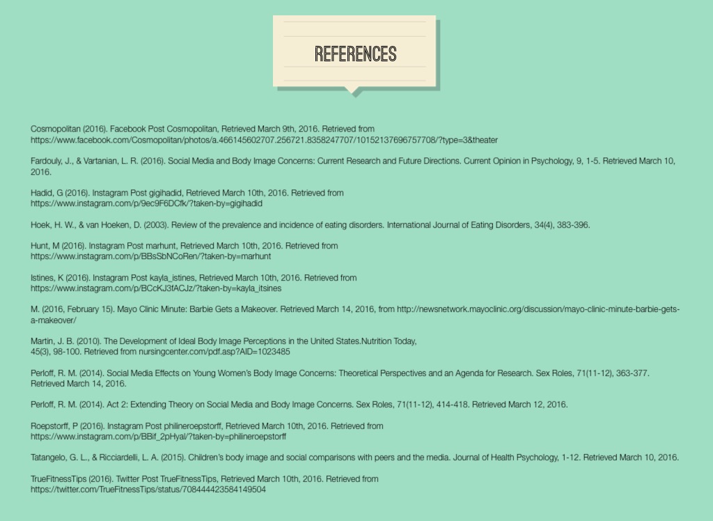 Fardouly, J., & Vartanian, L. R. (2016). Social Media and Body Image Concerns: Current Research and Future Directions. Current Opinion in Psychology, 9, 1-5. Retrieved March 10, 2016.