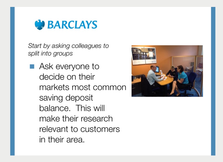 Ask everyone to decide on their markets most common saving deposit balance. This will make their research relevant to customers in their area.