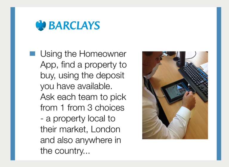 Using the Homeowner App, find a property to buy, using the deposit you have available. Ask each team to pick from 1 from 3 choices - a property local to their market, London and also anywhere in the country...