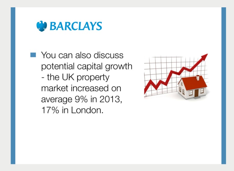 You can also discuss potential capital growth - the UK property market increased on average 9% in 2013, 17% in London.