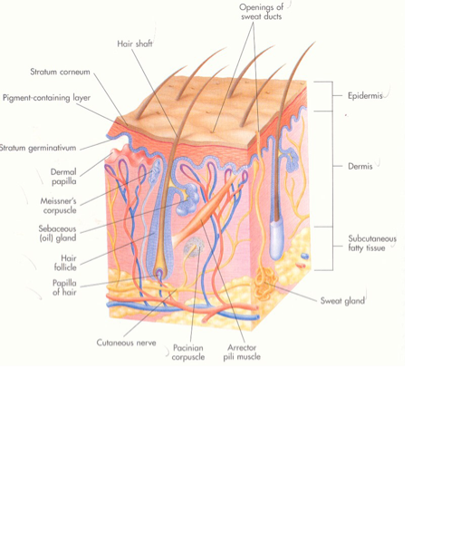 The skin consists of the epidermis and the dermis. The epidermis is the most superficial layer of skin that covers all most all of the body. The epidermis protects the deeper layer of skin. The dermis is the deeper layer of skin found under the epidermis. It's mostly made up of irregular connective tissue along with the nervous tissue, blood, and blood vessels. The integumentary system protects the body from different types of damage such as loss of water or scrape. The integumentary system consists of skin, hair, nails, glands, and nerves. The main function is to act as protection against the outside world.
