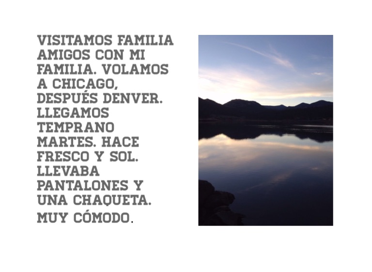 Visitamos familia amigos con mi familia. Volamos a Chicago, después Denver. Llegamos temprano Martes. Hace fresco y sol. Llevaba pantalones y una chaqueta. Muy cómodo.