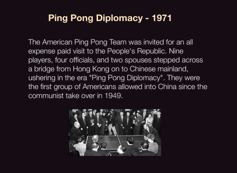 The American Ping Pong Team was invited for an all expense paid visit to the People's Republic. Nine players, four officials, and two spouses stepped across a bridge from Hong Kong on to Chinese mainland, ushering in the era "Ping Pong Diplomacy". They were the first group of Americans allowed into China since the communist take over in 1949.