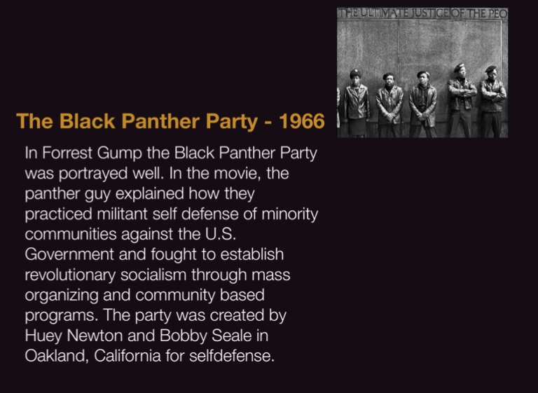 In Forrest Gump the Black Panther Party was portrayed well. In the movie, the panther guy explained how they practiced militant self defense of minority communities against the U.S. Government and fought to establish revolutionary socialism through mass organizing and community based programs. The party was created by Huey Newton and Bobby Seale in Oakland, California for selfdefense.