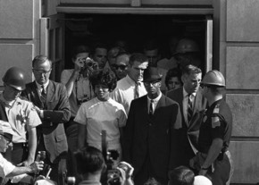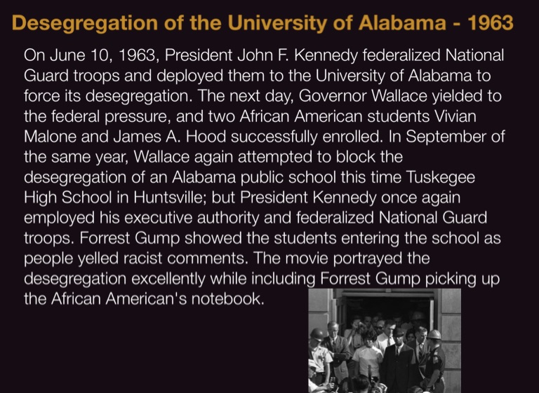 On June 10, 1963, President John F. Kennedy federalized National Guard troops and deployed them to the University of Alabama to force its desegregation. The next day, Governor Wallace yielded to the federal pressure, and two African American students Vivian Malone and James A. Hood successfully enrolled. In September of the same year, Wallace again attempted to block the desegregation of an Alabama public school this time Tuskegee High School in Huntsville; but President Kennedy once again employed his executive authority and federalized National Guard troops. Forrest Gump showed the students entering the school as people yelled racist comments. The movie portrayed the desegregation excellently while including Forrest Gump picking up the African American's notebook.
