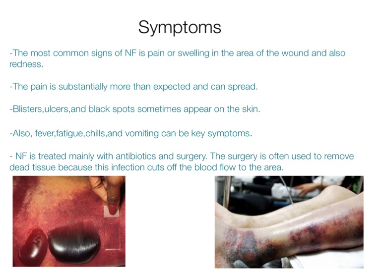 -The most common signs of NF is pain or swelling in the area of the wound and also redness.