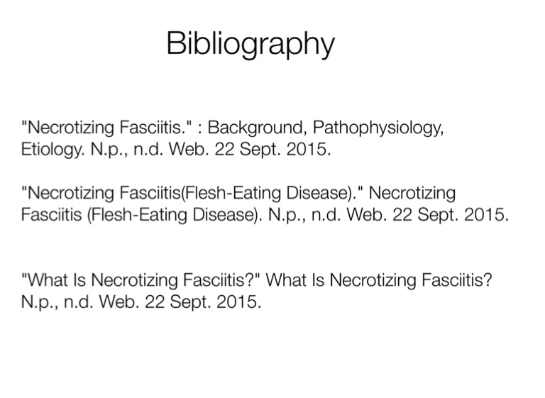 "Necrotizing Fasciitis(Flesh-Eating Disease)." Necrotizing Fasciitis (Flesh-Eating Disease). N.p., n.d. Web. 22 Sept. 2015.