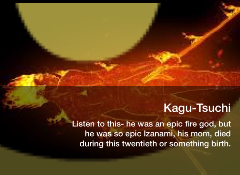 Listen to this- he was an epic fire god, but he was so epic Izanami, his mom, died during this twentieth or something birth.