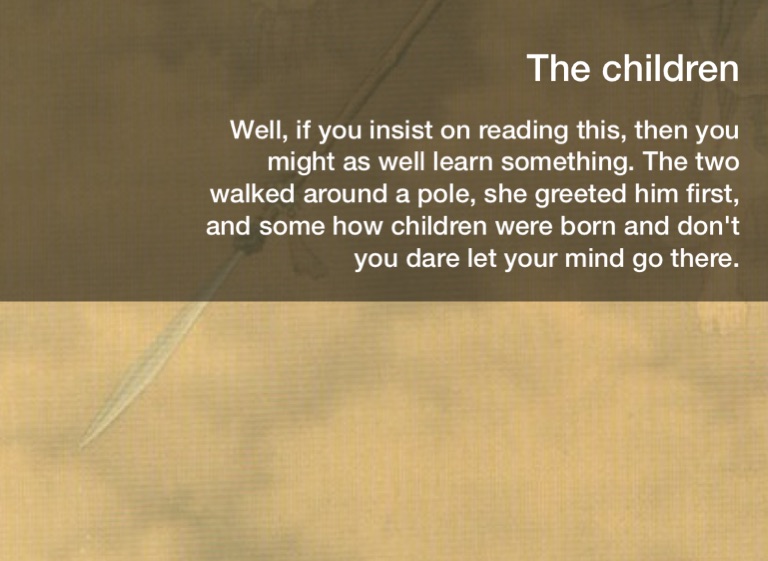 Well, if you insist on reading this, then you might as well learn something. The two walked around a pole, she greeted him first, and some how children were born and don't you dare let your mind go there.