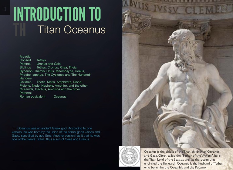 TextOceanus was an ancient Greek god. According to one version, he was born by the union of the primal gods Chaos and Gaea, sanctified by god Eros. Another version has it that he was one of the twelve Titans, thus a son of Gaea and Uranus.