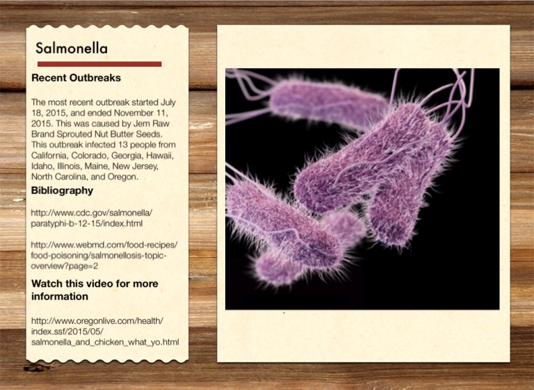 The most recent outbreak started July 18, 2015, and ended November 11, 2015. This was caused by Jem Raw Brand Sprouted Nut Butter Seeds. This outbreak infected 13 people from California, Colorado, Georgia, Hawaii, Idaho, Illinois, Maine, New Jersey, North Carolina, and Oregon.