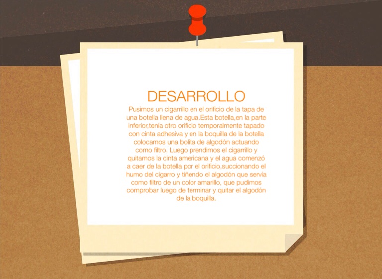 Pusimos un cigarrillo en el orificio de la tapa de una botella llena de agua.Esta botella,en la parte inferior,tenía otro orificio temporalmente tapado con cinta adhesiva y en la boquilla de la botella colocamos una bolita de algodón actuando como filtro. Luego prendimos el cigarrillo y quitamos la cinta americana y el agua comenzó a caer de la botella por el orificio,succionando el humo del cigarro y tiñendo el algodón que servía como filtro de un color amarillo, que pudimos comprobar luego de terminar y quitar el algodón de la boquilla.