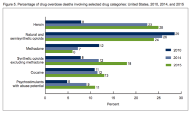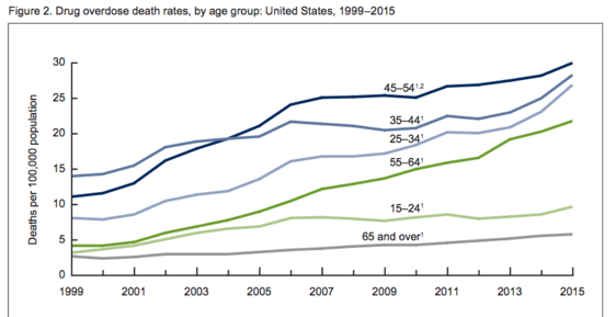 The percentage increase of drug overdose deaths among adults aged 55-64 rose from 4.2 per 100,000 in 1999 to 21.8 in 2015.