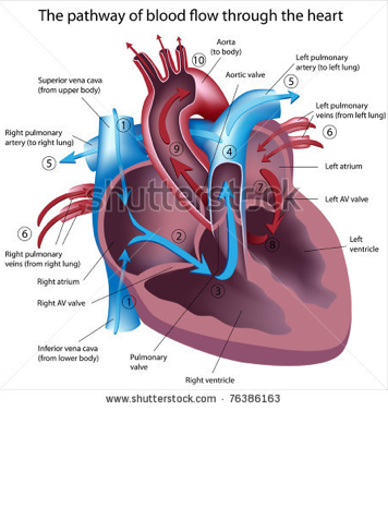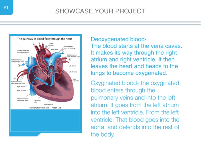 Deoxygenated blood- The blood starts at the vena cavas. It makes its way through the right atrium and right ventricle. It then leaves the heart and heads to the lungs to become oxygenated.