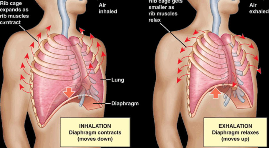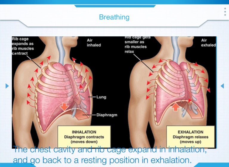 The chest cavity and rib cage expand in inhalation, and go back to a resting position in exhalation.