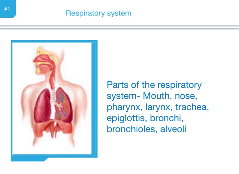 Parts of the respiratory system- Mouth, nose, pharynx, larynx, trachea, epiglottis, bronchi, bronchioles, alveoli
