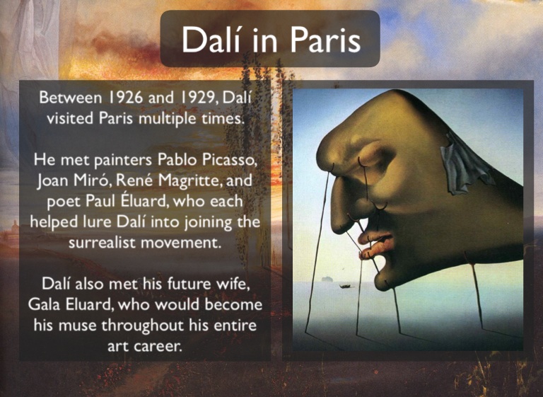 He met painters Pablo Picasso, Joan Miró, René Magritte, and poet Paul Éluard, who each helped lure Dalí into joining the surrealist movement.