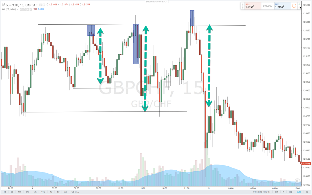 فريم ١٥ دقيقة على زوج الباوند استرالي من خط المقاومه تشكلت ٣ انواع الشموع البيعيه
