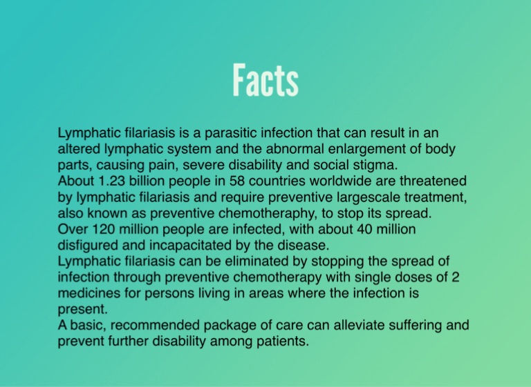 About 1.23 billion people in 58 countries worldwide are threatened by lymphatic filariasis and require preventive largescale treatment, also known as preventive chemotheraphy, to stop its spread.