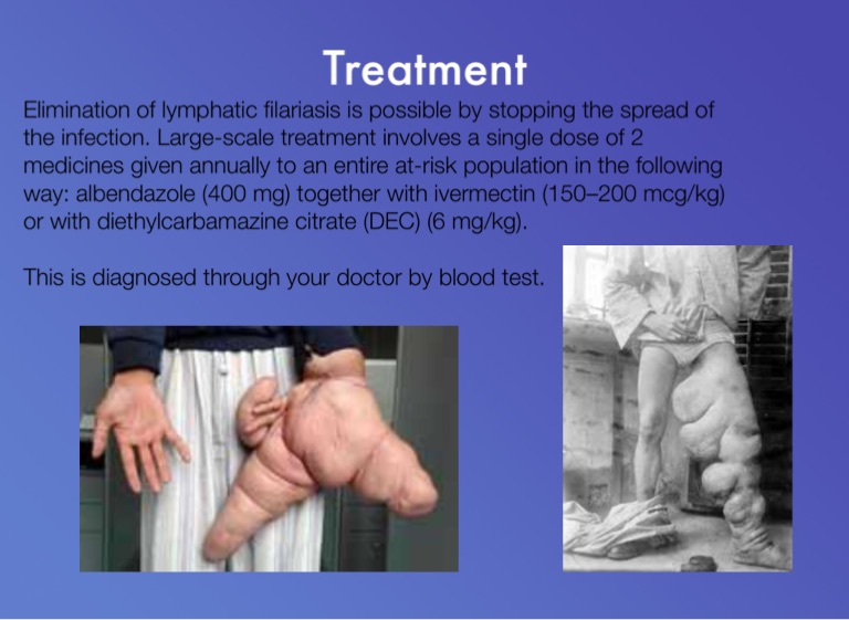 Elimination of lymphatic filariasis is possible by stopping the spread of the infection. Large-scale treatment involves a single dose of 2 medicines given annually to an entire at-risk population in the following way: albendazole (400 mg) together with ivermectin (150–200 mcg/kg) or with diethylcarbamazine citrate (DEC) (6 mg/kg).