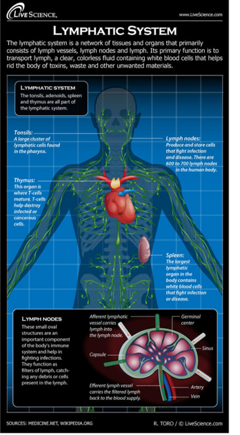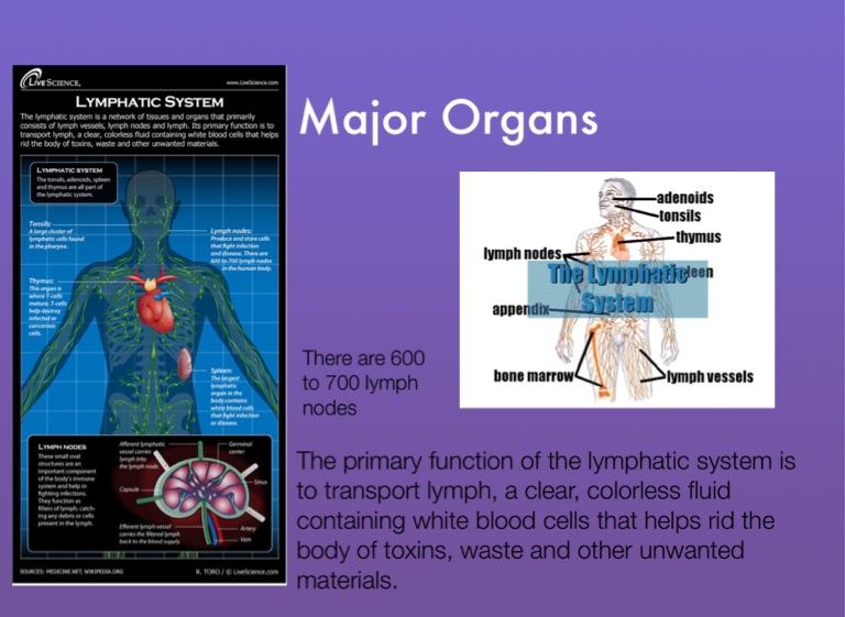 The primary function of the lymphatic system is to transport lymph, a clear, colorless fluid containing white blood cells that helps rid the body of toxins, waste and other unwanted materials.