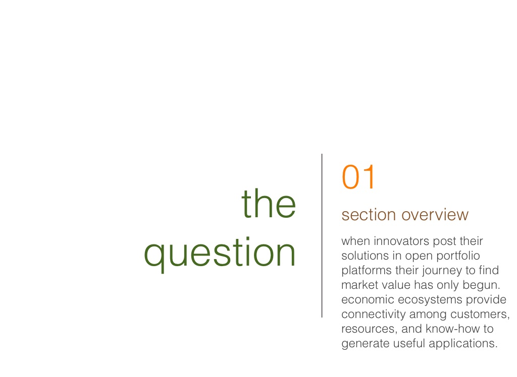 when innovators post their solutions in open portfolio platforms their journey to find market value has only begun. economic ecosystems provide connectivity among customers, resources, and know-how to generate useful applications.