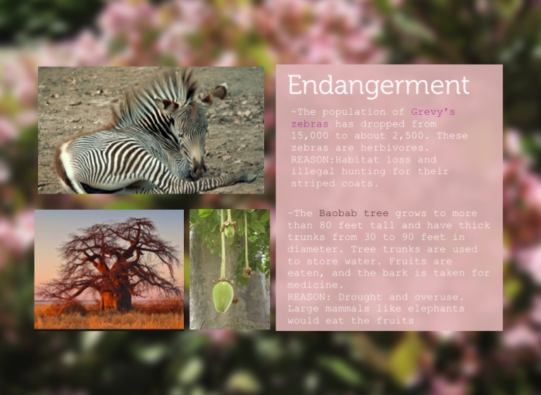 ~The population of Grevy's zebras has dropped from 15,000 to about 2,500. These zebras are herbivores. REASON:Habitat loss and illegal hunting for their striped coats.