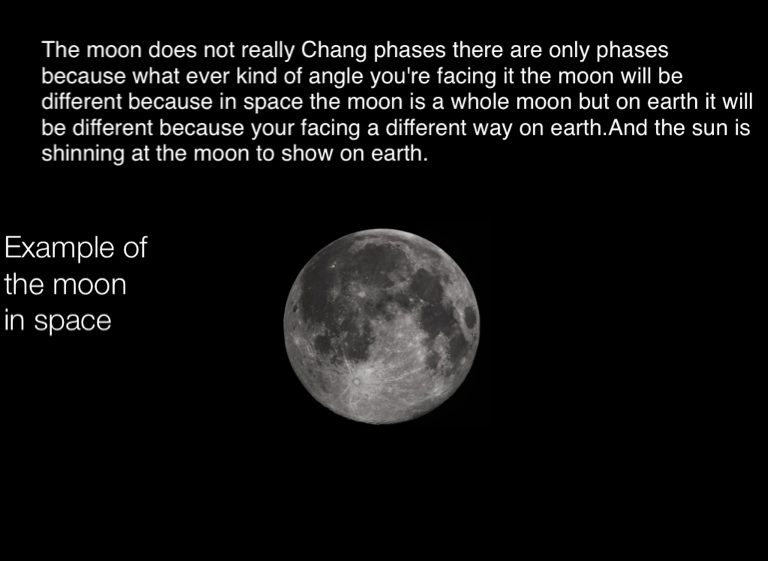 The moon does not really Chang phases there are only phases because what ever kind of angle you're facing it the moon will be different because in space the moon is a whole moon but on earth it will be different because your facing a different way on earth.And the sun is shinning at the moon to show on earth.