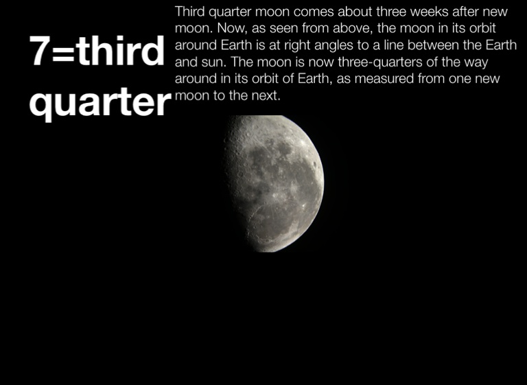 Third quarter moon comes about three weeks after new moon. Now, as seen from above, the moon in its orbit around Earth is at right angles to a line between the Earth and sun. The moon is now three-quarters of the way around in its orbit of Earth, as measured from one new moon to the next.