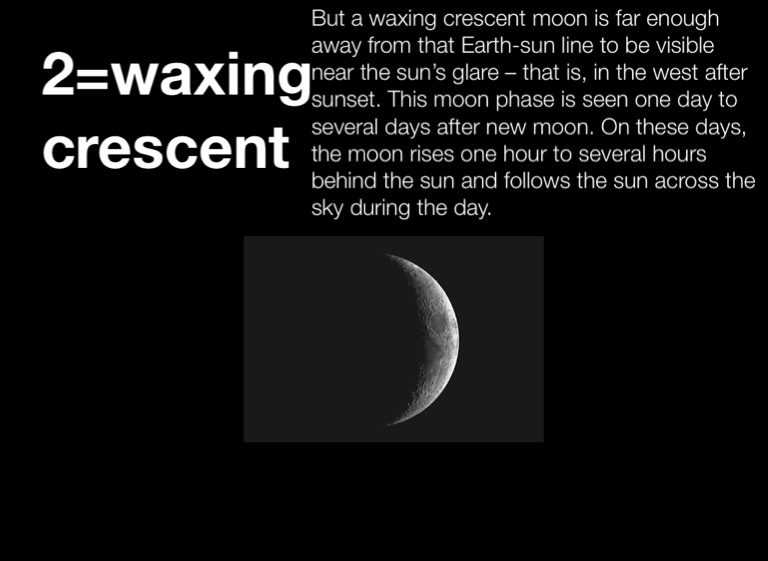 But a waxing crescent moon is far enough away from that Earth-sun line to be visible near the sun’s glare – that is, in the west after sunset. This moon phase is seen one day to several days after new moon. On these days, the moon rises one hour to several hours behind the sun and follows the sun across the sky during the day.