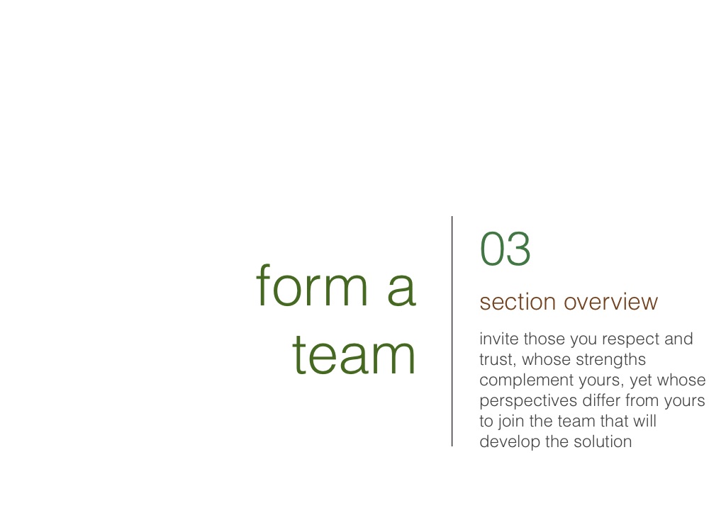 invite those you respect and trust, whose strengths complement yours, yet whose perspectives differ from yours to join the team that will develop the solution