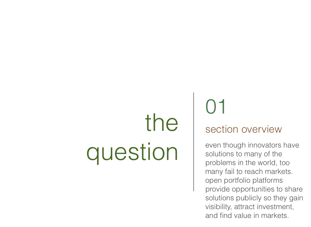 open portfolio platforms provide opportunities to share solutions publicly so they gain visibility, attract investment, and find value in markets.