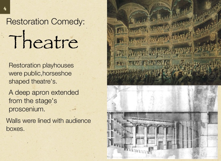 Restoration playhouses were public,horseshoe shaped theatre's.