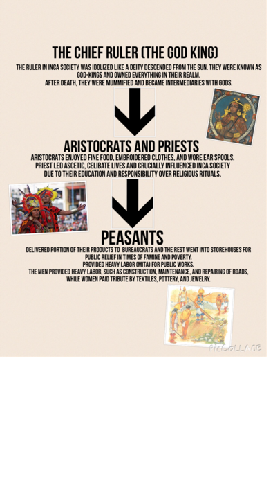Religious people or priests were considered elite and were often referenced as godly. The inca also had a bureaucracy so the government officials were higher up on the social chain. There were also the commoners aristocrats and peasants