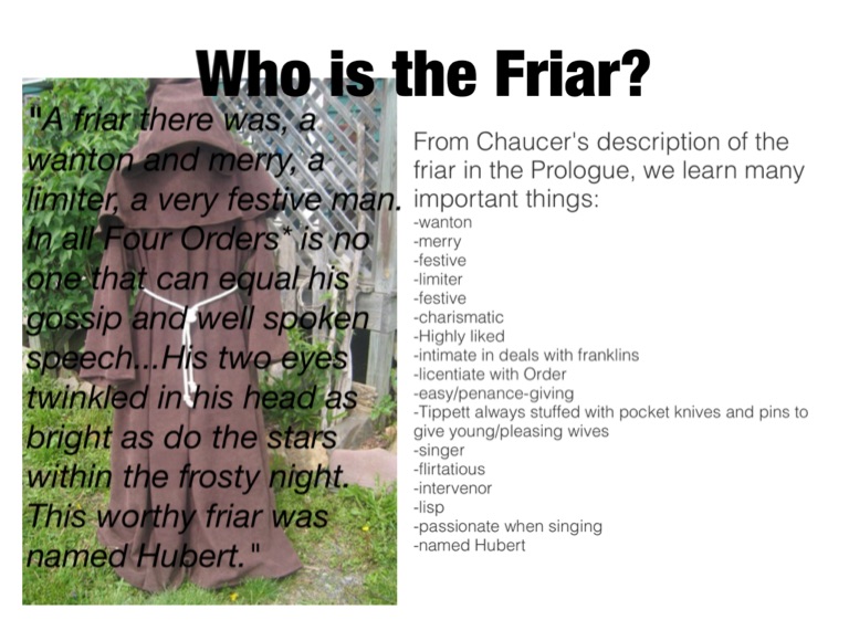 "A friar there was, a wanton and merry, a limiter, a very festive man. In all Four Orders* is no one that can equal his gossip and well spoken speech...His two eyes twinkled in his head as bright as do the stars within the frosty night. This worthy friar was named Hubert."