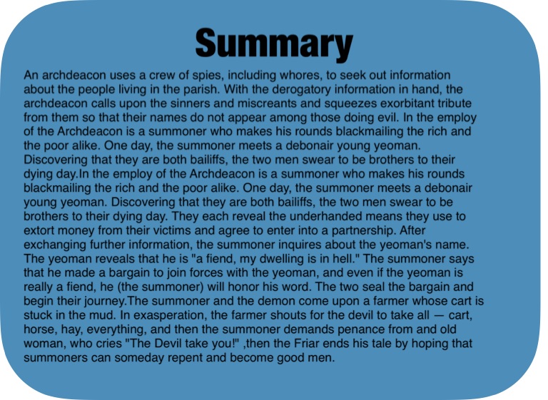 An archdeacon uses a crew of spies, including whores, to seek out information about the people living in the parish. With the derogatory information in hand, the archdeacon calls upon the sinners and miscreants and squeezes exorbitant tribute from them so that their names do not appear among those doing evil. In the employ of the Archdeacon is a summoner who makes his rounds blackmailing the rich and the poor alike. One day, the summoner meets a debonair young yeoman. Discovering that they are both bailiffs, the two men swear to be brothers to their dying day.In the employ of the Archdeacon is a summoner who makes his rounds blackmailing the rich and the poor alike. One day, the summoner meets a debonair young yeoman. Discovering that they are both bailiffs, the two men swear to be brothers to their dying day. They each reveal the underhanded means they use to extort money from their victims and agree to enter into a partnership. After exchanging further information, the summoner inquires about the yeoman's name. The yeoman reveals that he is "a fiend, my dwelling is in hell." The summoner says that he made a bargain to join forces with the yeoman, and even if the yeoman is really a fiend, he (the summoner) will honor his word. The two seal the bargain and begin their journey.The summoner and the demon come upon a farmer whose cart is stuck in the mud. In exasperation, the farmer shouts for the devil to take all — cart, horse, hay, everything, and then the summoner demands penance from and old woman, who cries "The Devil take you!" ,then the Friar ends his tale by hoping that summoners can someday repent and become good men.