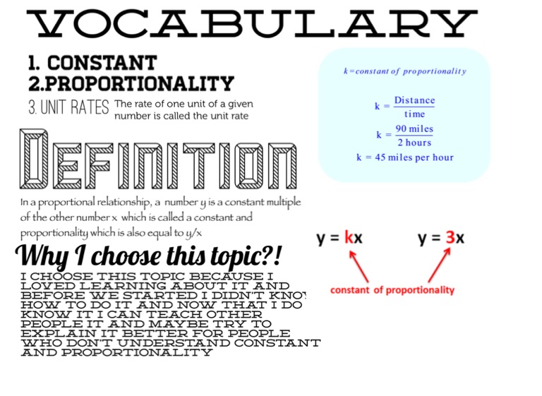I choose this topic because I loved learning about it and before we started I didn't know how to do it and now that I do know it I can teach other people it and maybe try to explain it better for people who don't understand constant and proportionality