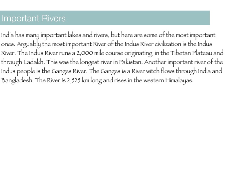 India has many important lakes and rivers, but here are some of the most important ones. Arguably the most important River of the Indus River civilization is the Indus River. The Indus River runs a 2,000 mile course originating in the Tibetan Plateau and through Ladakh. This was the longest river in Pakistan. Another important river of the Indus people is the Ganges River. The Ganges is a River witch flows through India and Bangladesh. The River Is 2,525 km long and rises in the western Himalayas.