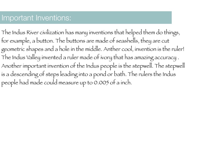 The Indus River civilization has many inventions that helped them do things, for example, a button. The buttons are made of seashells, they are cut geometric shapes and a hole in the middle. Anther cool, invention is the ruler! The Indus Valley invented a ruler made of ivory that has amazing accuracy . Another important invention of the Indus people is the stepwell. The stepwell is a descending of steps leading into a pond or bath. The rulers the Indus people had made could measure up to 0.005 of a inch.