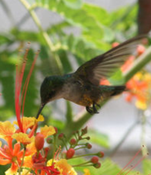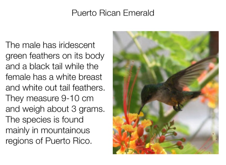 The male has iridescent green feathers on its body and a black tail while the female has a white breast and white out tail feathers. They measure 9-10 cm and weigh about 3 grams. The species is found mainly in mountainous regions of Puerto Rico.