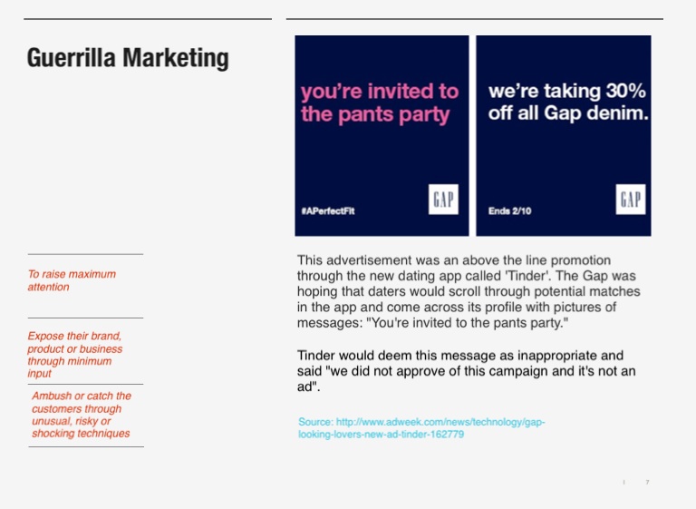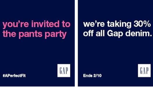 This advertisement was an above the line promotion through the new dating app called 'Tinder'. The Gap was hoping that daters would scroll through potential matches in the app and come across its profile with pictures of messages: "You're invited to the pants party."