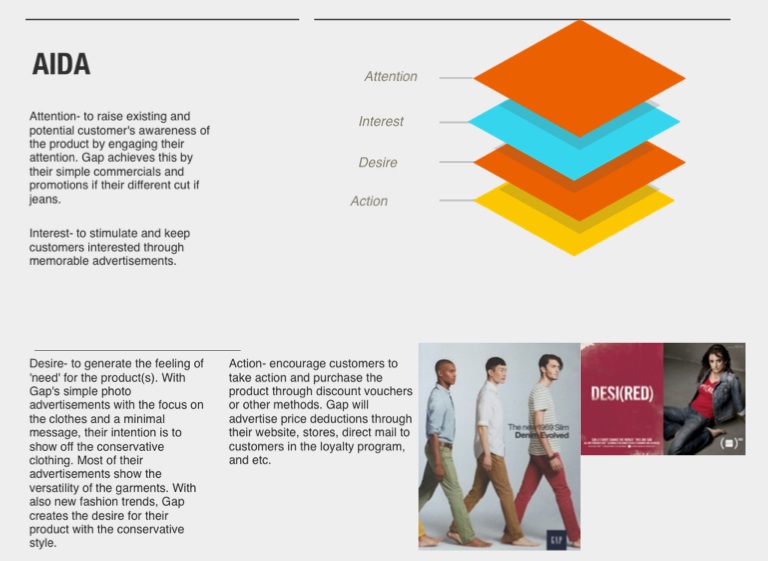 Attention- to raise existing and potential customer's awareness of the product by engaging their attention. Gap achieves this by their simple commercials and promotions if their different cut if jeans.
